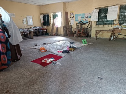 students sit on the floor, while others Many students even stand or sit on stones or blocks during lessons. This makes it hard for them to learn well. Teachers also face problems because the classrooms are too crowded. Some students cannot see the board or write properly. When it rains, the floor gets wet, and it becomes even harder to learn.